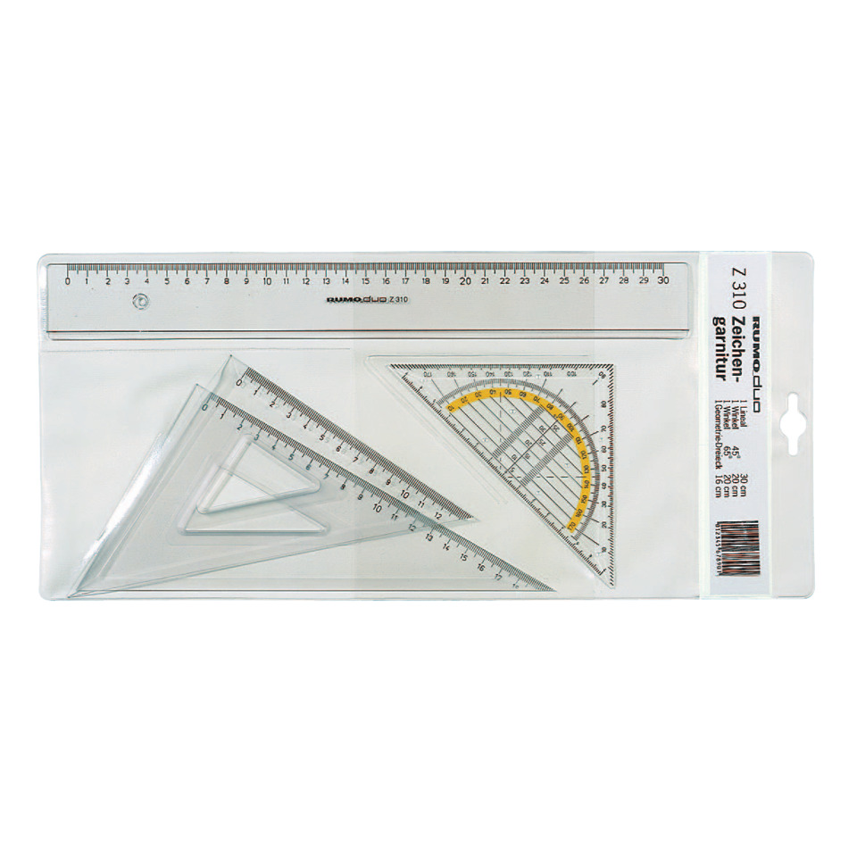 Set bestehend aus: Lineal 30 cm, Zeichendreieck 45°/20 cm, Zeichendreieck 60°/20 cm, Geometriedreieck 16 cm. Aus rauchgrauem Kunststoff. Im Etui.