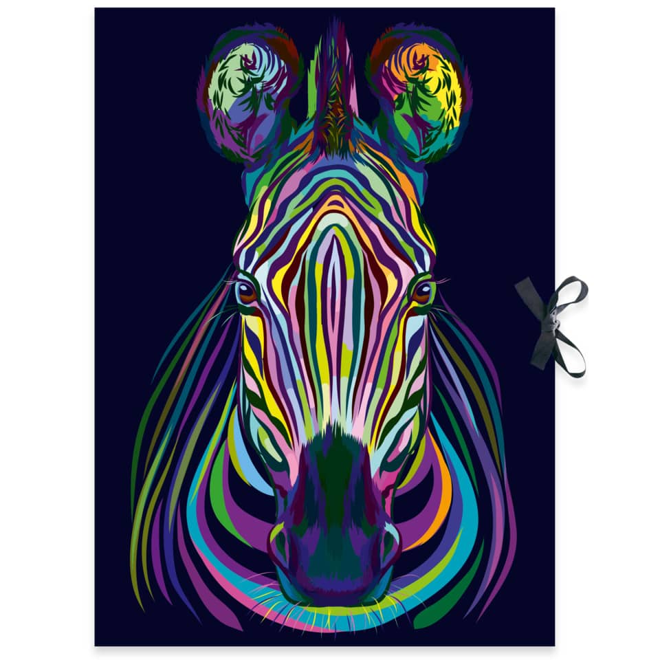 Zeichenmappe DIN A2 „Neon“. 3 Klappen (Jurisklappen) am Unterdeckel vorhanden. Art des Verschlusses: Verschlussband. Werkstoff: stabiler Karton. Flächenmasse des Papiers: 500 g/qm. Verwendung für Papierformate: DIN A2. Größe (B x H): 440 x 620 mm. Farbe: bunt. Typbezeichnung des Motivs: „Neon“.
