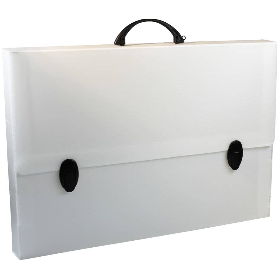 Zeichenkoffer mit Tragegriff und 2 Verschlüssen in Farbe weiß. Material Polypropylen (PP) 2,5 mm stark und 480 g/qm, widerstandsfähig und abwischbar. Für Format A3 passend. Größe (BxHxT): 53 x 38 x 5 cm.
