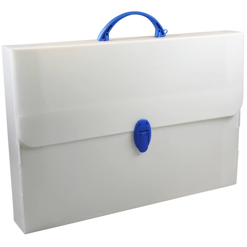 Zeichenkoffer mit Tragegriff und Verschluss in Farbe weiß. Material: Polypropylen (PP) 2,5 mm stark und 480 g/qm, widerstandsfähig und abwischbar. Für Format A4 passend. Größe (BxHxT): 45,5 x 31 x 6 cm